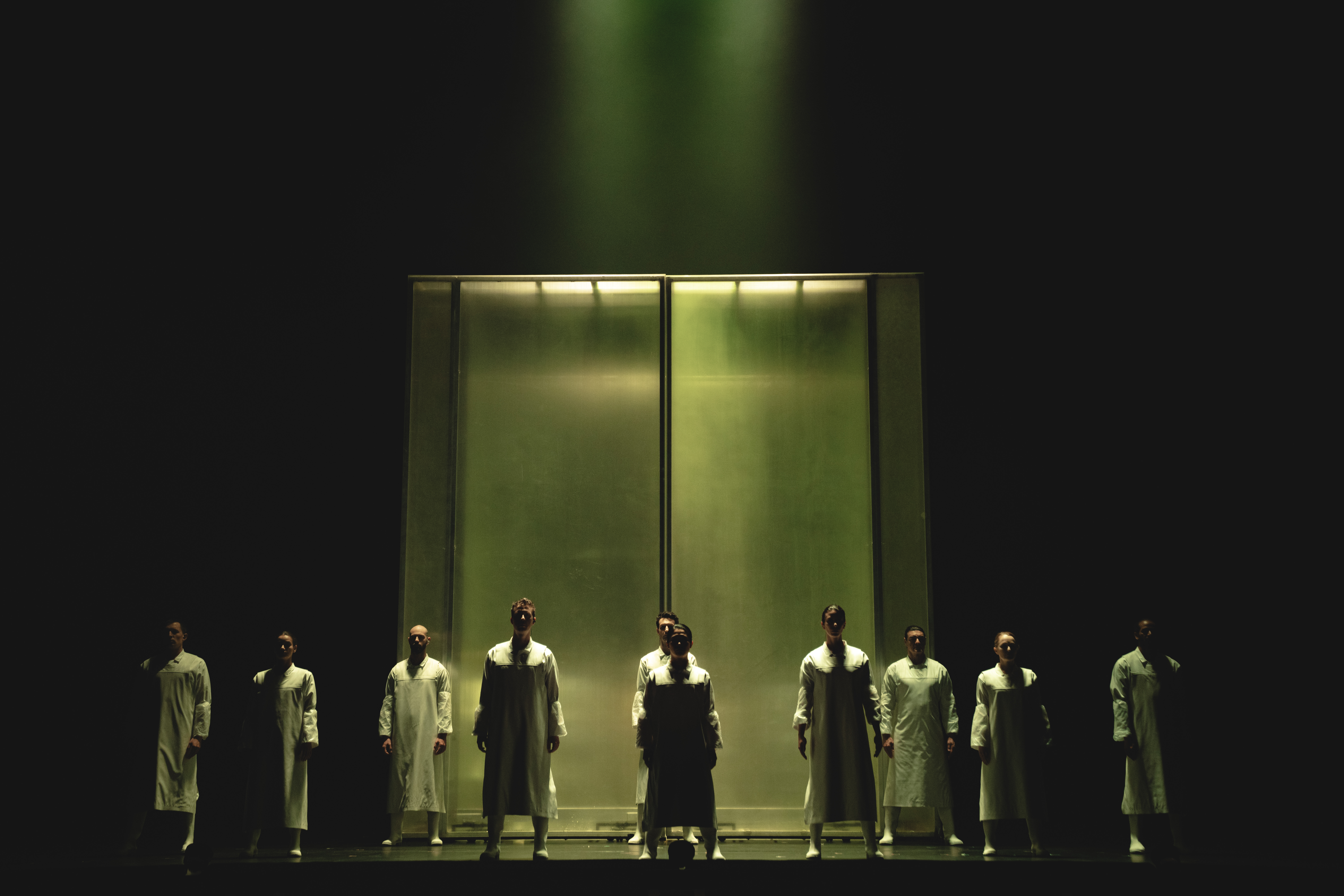 Ce décor abstrait verra quelques projections discrètes d’un scanner de cerveau, de photos d’enfant au moment où il se résout à sacrifier son fils ou de la mer tout à la fin pendant que le chœur hurle sa peur du monstre marin,  devenu un dresseur de cirque faisant claquer un fouet. Le décor deviendra aussi hôpital psychiatrique à électrochocs pour le héros traumatisé. Et finalement, au happy end, il surgira, magnifié, comme une ville contemporaine de tours lumineuses.