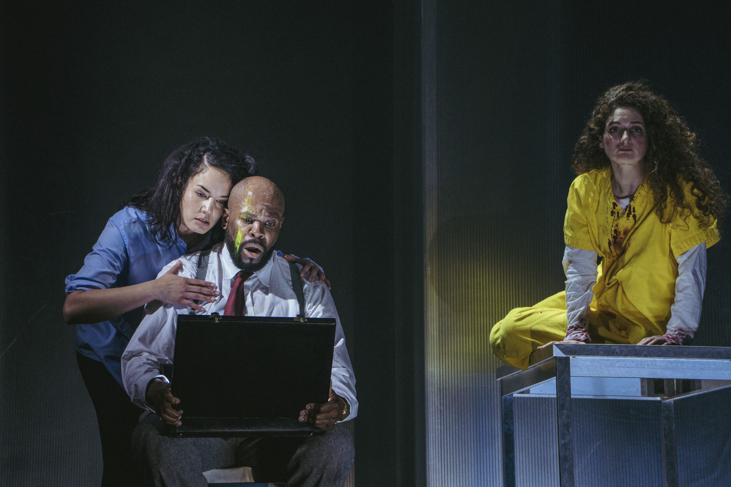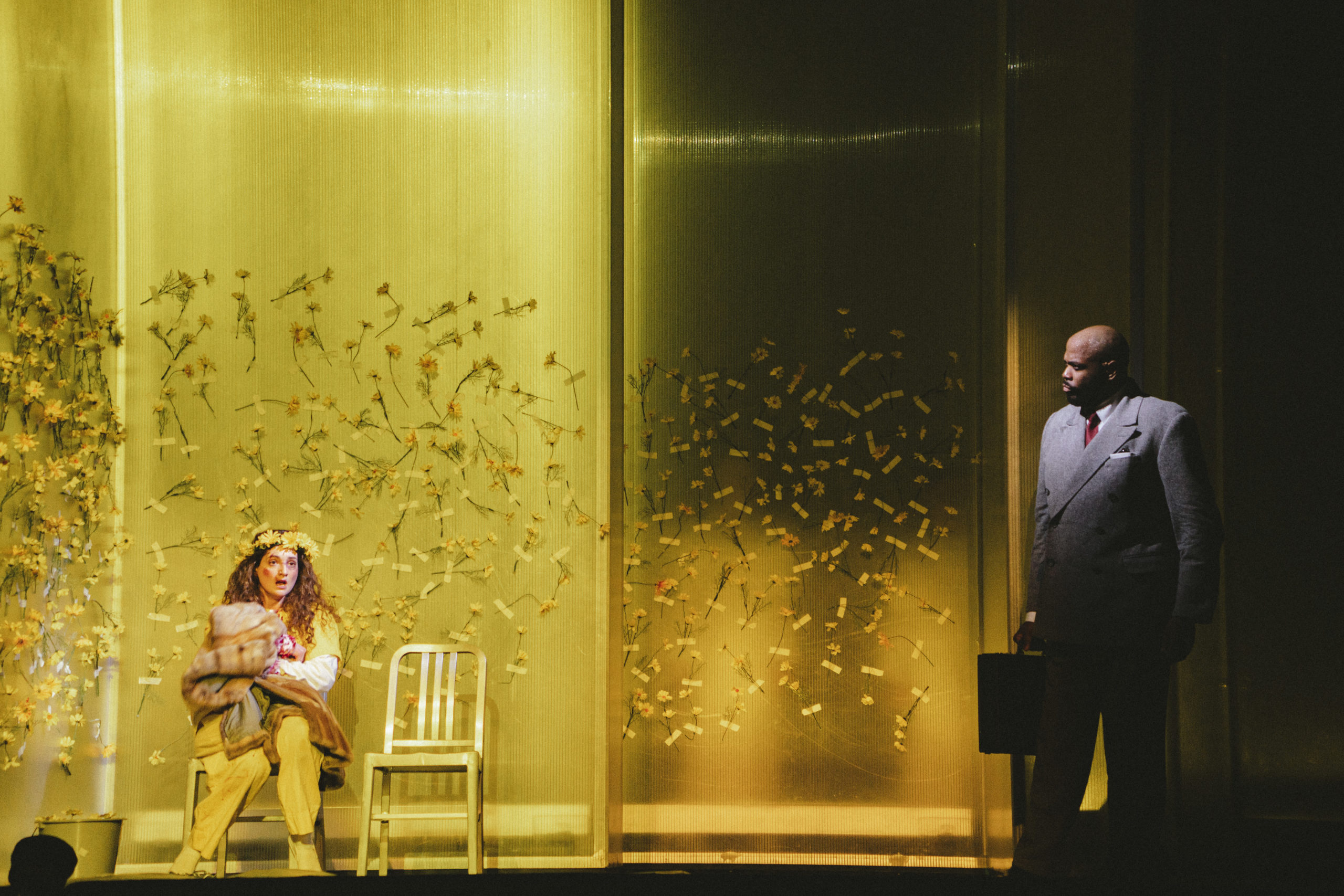 Un des mérites incontestables de Calixto Bieito est sa direction d’interprètes. Electre en grande bourgeoise buñuelienne pourquoi pas? Sa rivale Ilia en prisonnière, tenue jaune aux bras sanglants accentue la fragilité de la soprano israélienne Shira Patchornik, voix pure mais manquant de projection à la première. La mezzo française Gaëlle Arquez, pantalon et chemise, a l’assurance tranquille du fils Idamante, sûr de lui dans toutes les situations. Une des très grandes voix de la soirée, stable, colorée, vibrante, chaleureuse.