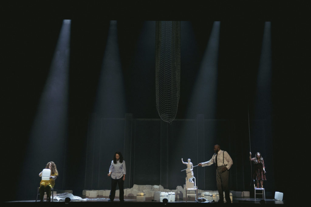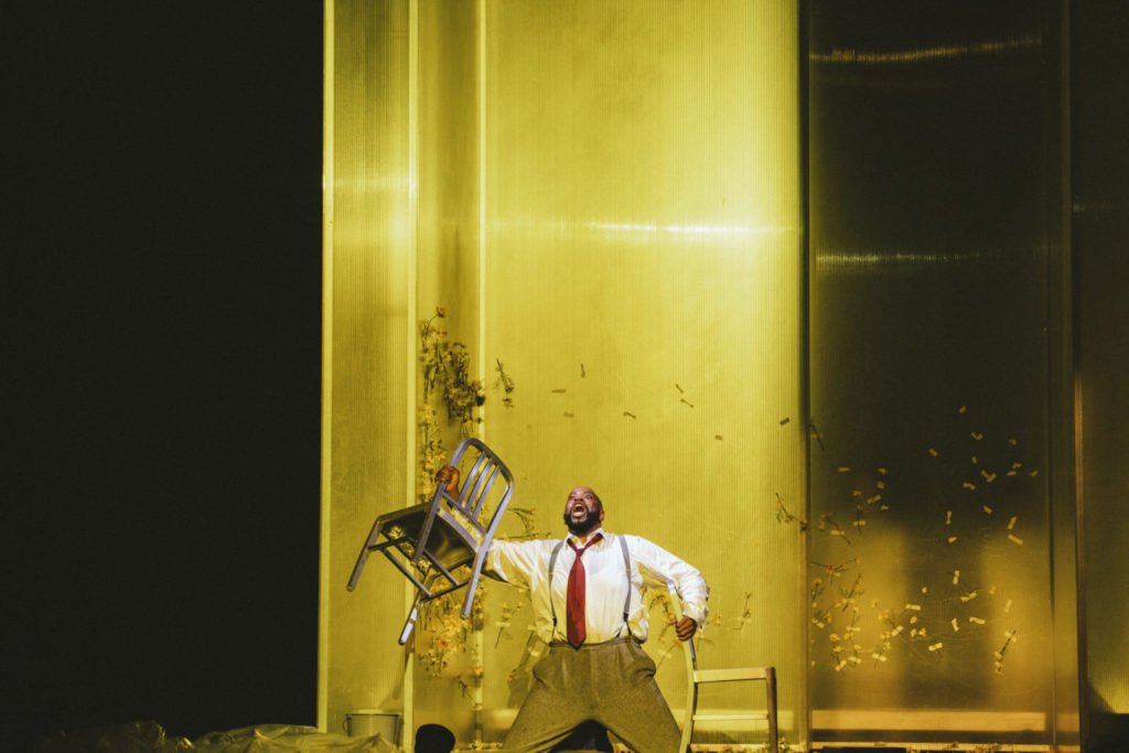 Quant à Neptune, son monstre et surtout sa divine mer ils sont pratiquement invisibles ou alors caricaturés par de grands bidons en plastique qui dévalent du plafonf au dernier acte. La mer et le plastique ? Clin d’œil politique ? Autre clin d’œil, un peu kitsch : la malheureuse Electre – dans son grand air d’amour – se caressant érotiquement avec les chaussures du héros comme dans un film fétichiste de Buñuel des années 60. Le comble : l’extraordinaire interprète d’Electre, Kathryn Lewek, Reine de la Nuit réputée, soprano colorature américaine à la voix puissante et extraordinairement bien modulée, réussit aussi ce tour de force d’une chorégraphie réussie mettant sa voix à l’épreuve. Sa colère finale, sublime!