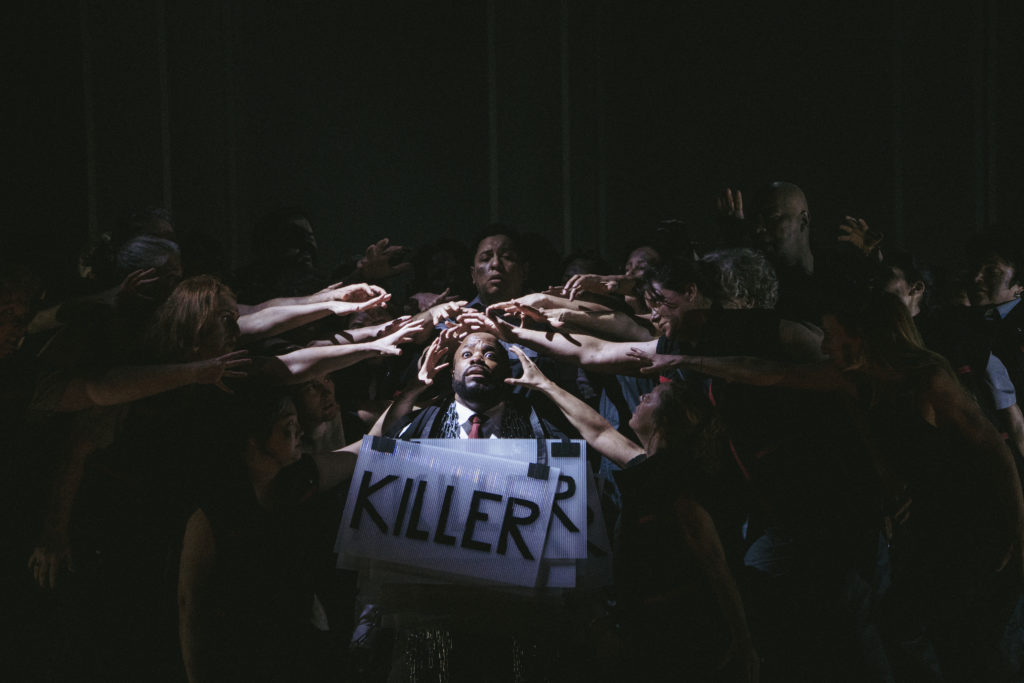 Le  rôle-titre est  tenu par le ténor américain Joshua Stewart, un colosse à la voix bien calibrée, dans le grave comme dans le pointu : quelle justesse du corps, du visage, de la moindre inflexion de douleur, de tristesse, d’action sauvage ou de nostalgie. Il subit dans le corps comme dans la voix tout le poids de cette guerre foutue, gagnée et perdue comme toute guerre. Il faut le voir déambuler perdu, hagard, sur une marche militaire pour éprouver dans le corps et la tête l’absurdité de la guerre. L’interprète et le metteur en scène se sont manifestement entendus à merveille.