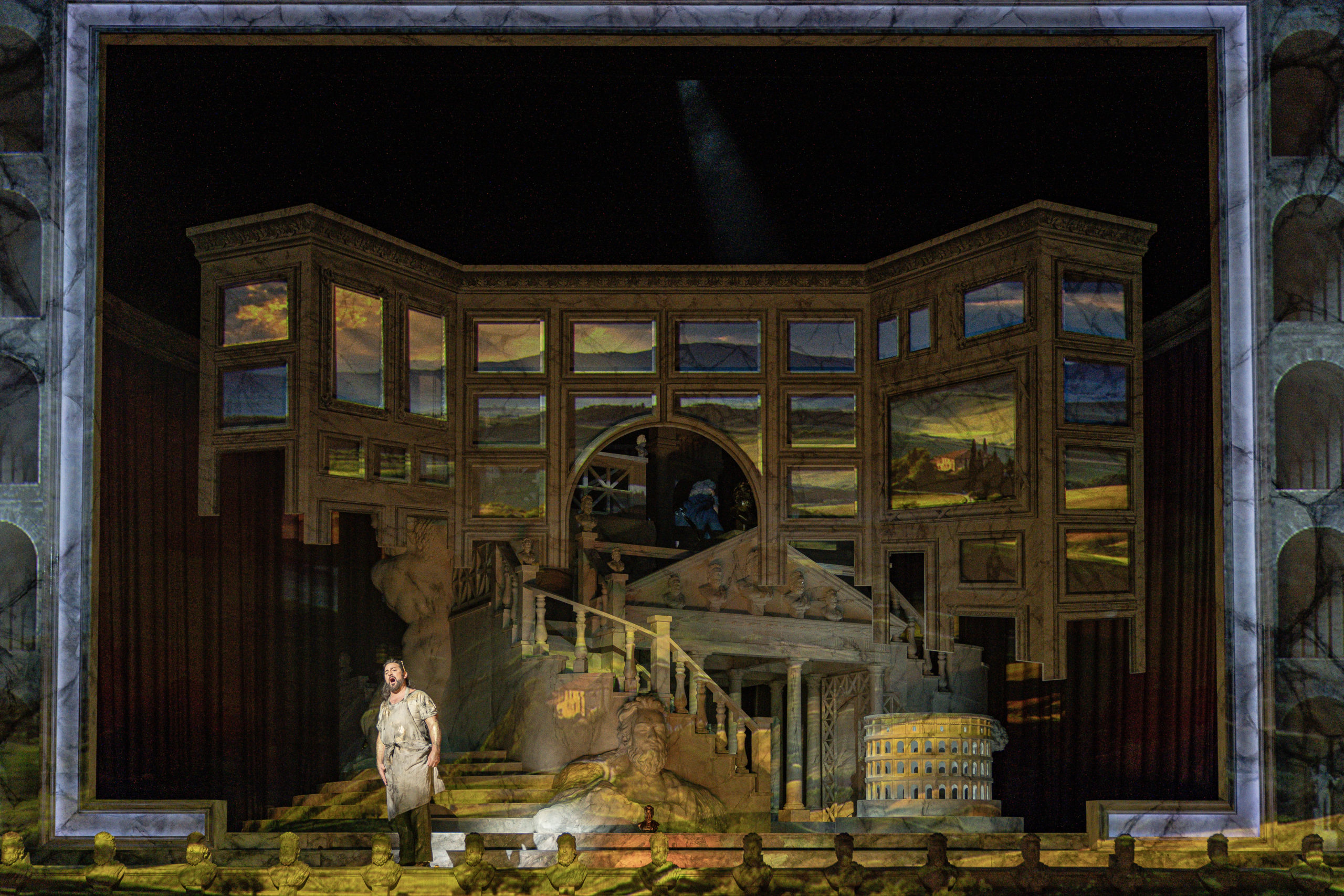 Aux spectateur.ices de s’accrocher ! Sur scène, l’unité de lieu est la ville de Rome que le metteur en scène Thaddeus Strassberger (qui signe aussi les décors) rend obsessionnelle par un tourniquet central reproduisant monuments et statues, ce qui permet de varier les scènes mais nous inflige une énorme pièce montée blanche omniprésente. Des multitudes de costumes bigarrés de toutes les époques donnent le tournis d’un défilé de mode permanent de la Renaissance à Gucci, en passant par une sorte d’Artémis d’Ephèse (déesse nourricière aux seins multiples). Des statues humaines marbrées, des Muses détachées du plafond de La Monnaie imposent leur présence vaguement chorégraphiée d’acte en acte ce qui distrait l’attention de l’action. La présence du vaillant chœur de La Monnaie, agissant et chantant dans cet espace réduit achève de saturer nos yeux au détriment de nos oreilles à l’affût de la splendeur de la partition. La saturation est maximale. Heureusement, le 3ème acte, avec la rencontre de Pape dans l’ atelier et la fusion de la statue au Colisée libère l’espace de beaucoup de superflu et permet d’entendre enfin cette musique séduisante dont les trouvailles, les feux d’artifices symphoniques (pas seulement dans l’ouverture d’anthologie), les cadeaux rythmés ou méditatifs aux chœurs – percutants – et aux solistes – inspirés – font notre bonheur.